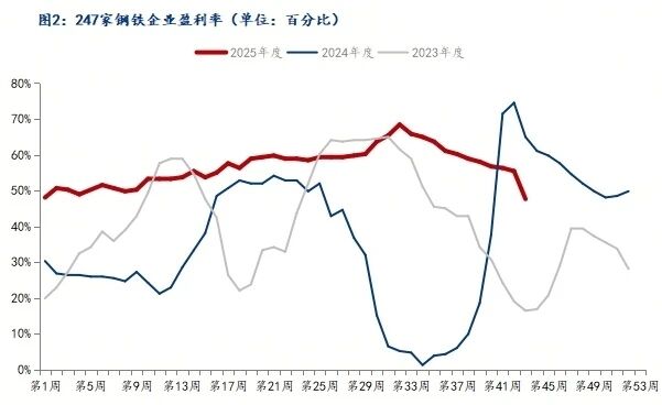 从市场基本面看,供需两端的失衡持续加剧。9月上旬全国21个城市五大品种钢材库存攀升至920万吨,同比增幅4.1%,库存压力已连续三个月高于去年同期。需求端则受房地产低迷拖累,1-8月房地产开发投资同比下降12.9%,钢材终端消费 旺季不旺成为常态。即便如此,钢厂主动减产的动力依然不足。截至10月27日 Mysteel调研247家钢厂高炉开工率84.71%,环比上周增加0.44个百分点,同比去年增加2.57个百分点 。高炉炼铁产能利用率89.94%,环比上周减少0.39个百分点 ,同比去年增加1.46个百分点;钢厂盈利率47.62%,环比上周减少7.79个百分点,同比去年减少17.32个百分点;日均铁水产量239.9万吨,环比上周减少1.05万吨,同比去年增加4.21万吨。 盈利钢企平均吨钢利润较 8 月下降 18.3%,二季度以来的盈利高峰已逐步消退。其中,头部钢企凭借前期低价原料锁定、高端钢材产品结构优势,盈利韧性相对较强,但也面临订单增速放缓的压力。中小钢厂则因以螺纹钢等普通建材为主,深陷“订单不足 - 降价抢单 - 利润收窄”的恶性循环,部分中小普钢企业的螺纹钢业务吨钢利润已跌破 30 元,较二季度峰值缩水超 80%,虽未亏损却已逼近盈利临界点。